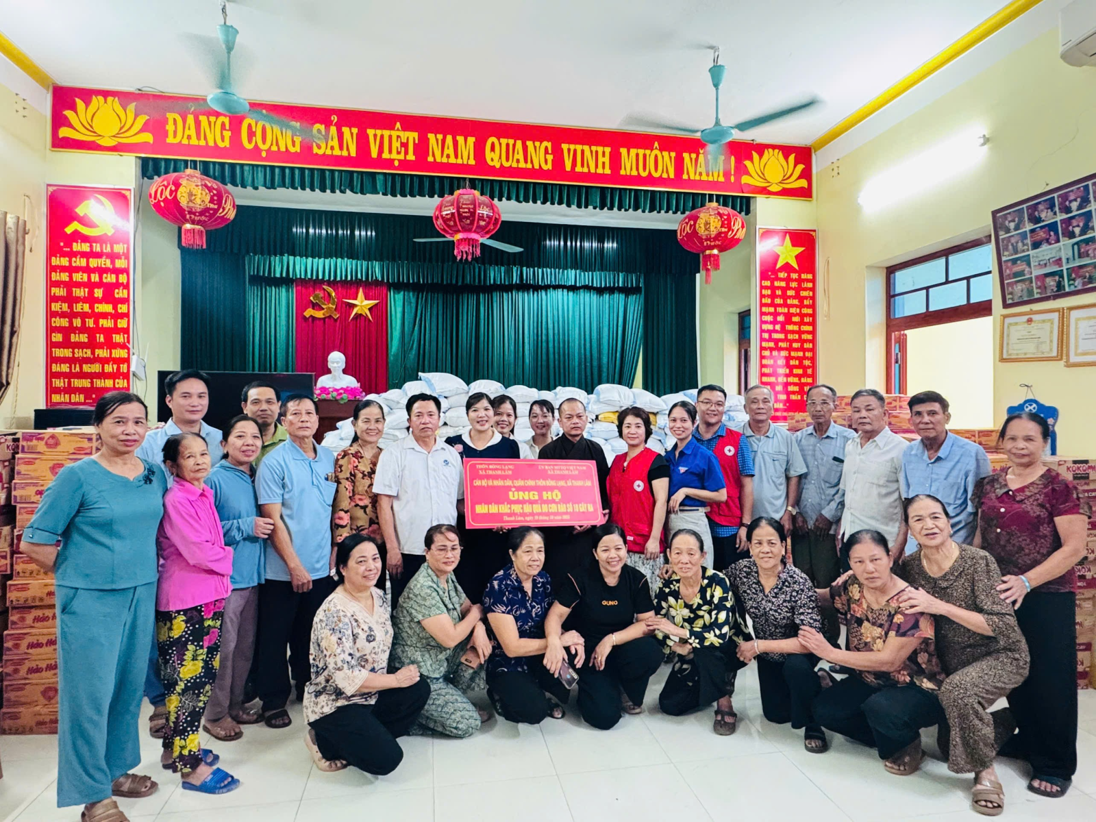 Cán bộ và nhân dân thôn Bồng Lạng trao biển ủng hộ cho Chùa Hoa Lâm và Hội Chữ thập đỏ tỉnh