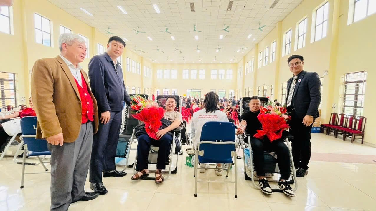 Ông Trần Phước Thắng - Phó Chủ tịch Hội Chữ thập đỏ tỉnh Ninh Bình tặng hoa thăm hỏi người tham gia hiến máu tình nguyện tại điểm phường Trường Thi