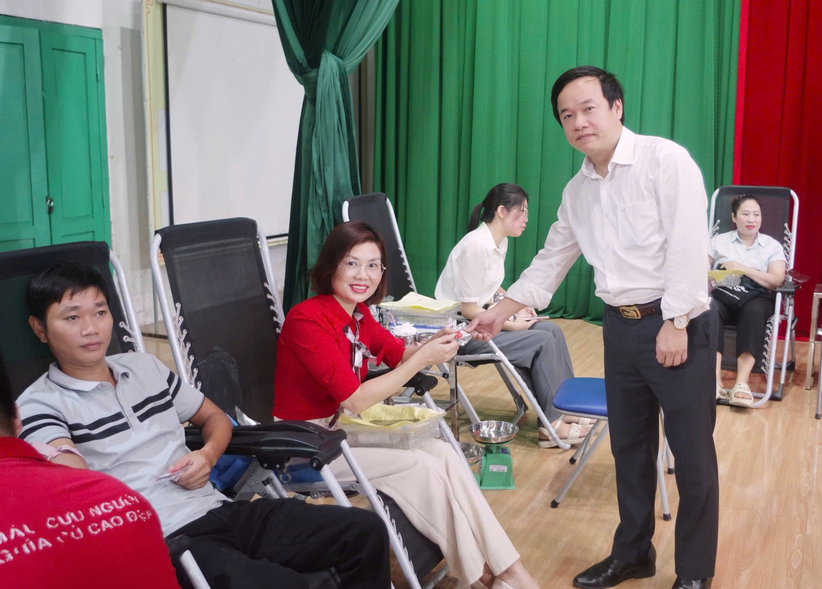 Bà Phạm Thị Thùy - Ủy viên BTV, Trưởng Ban Chăm sóc sức khỏe cộng đồng Hội Chữ thập đỏ tỉnh Ninh Binh thăm hỏi người tham gia hiến máu tình nguyện
