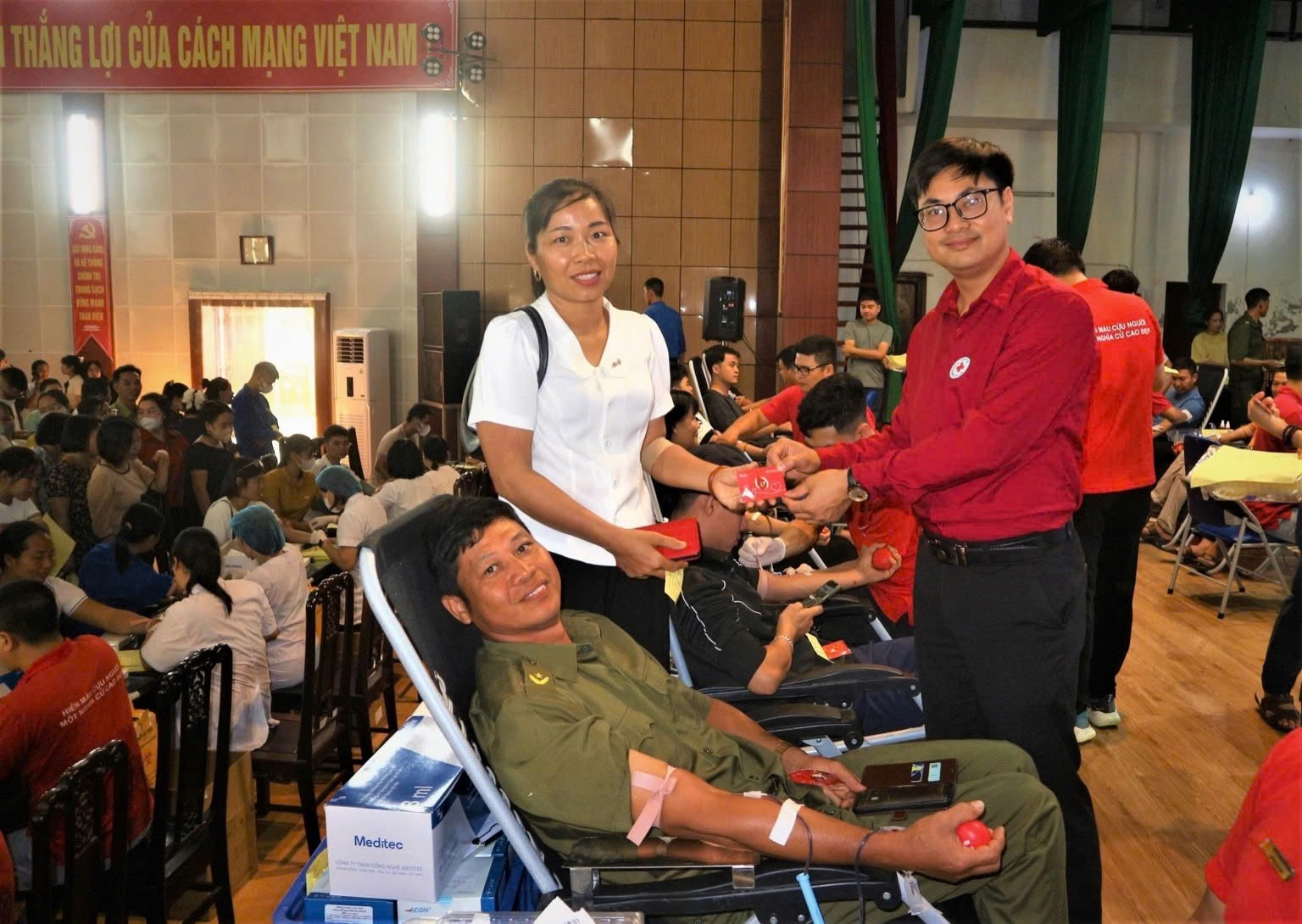 Ông Trần Phước Thắng - Phó Chủ tịch Hội Chữ thập đỏ tỉnh Ninh Bình tặng quà thăm hỏi người tham gia hiến máu