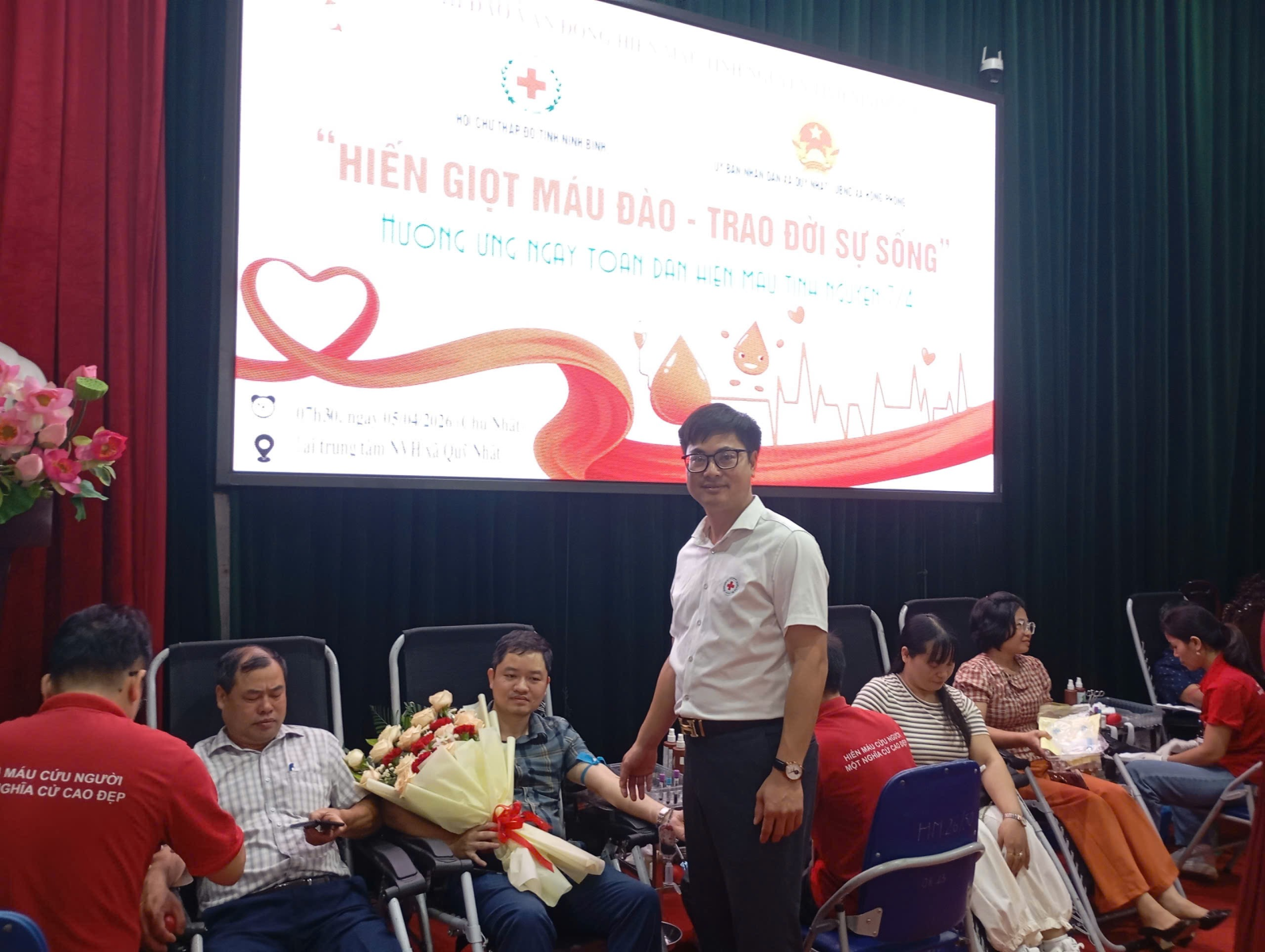 Ông Trần Phước Thắng - Phó Chủ tịch Hội CTĐ tỉnh tặng hoa động viên người hiến máu