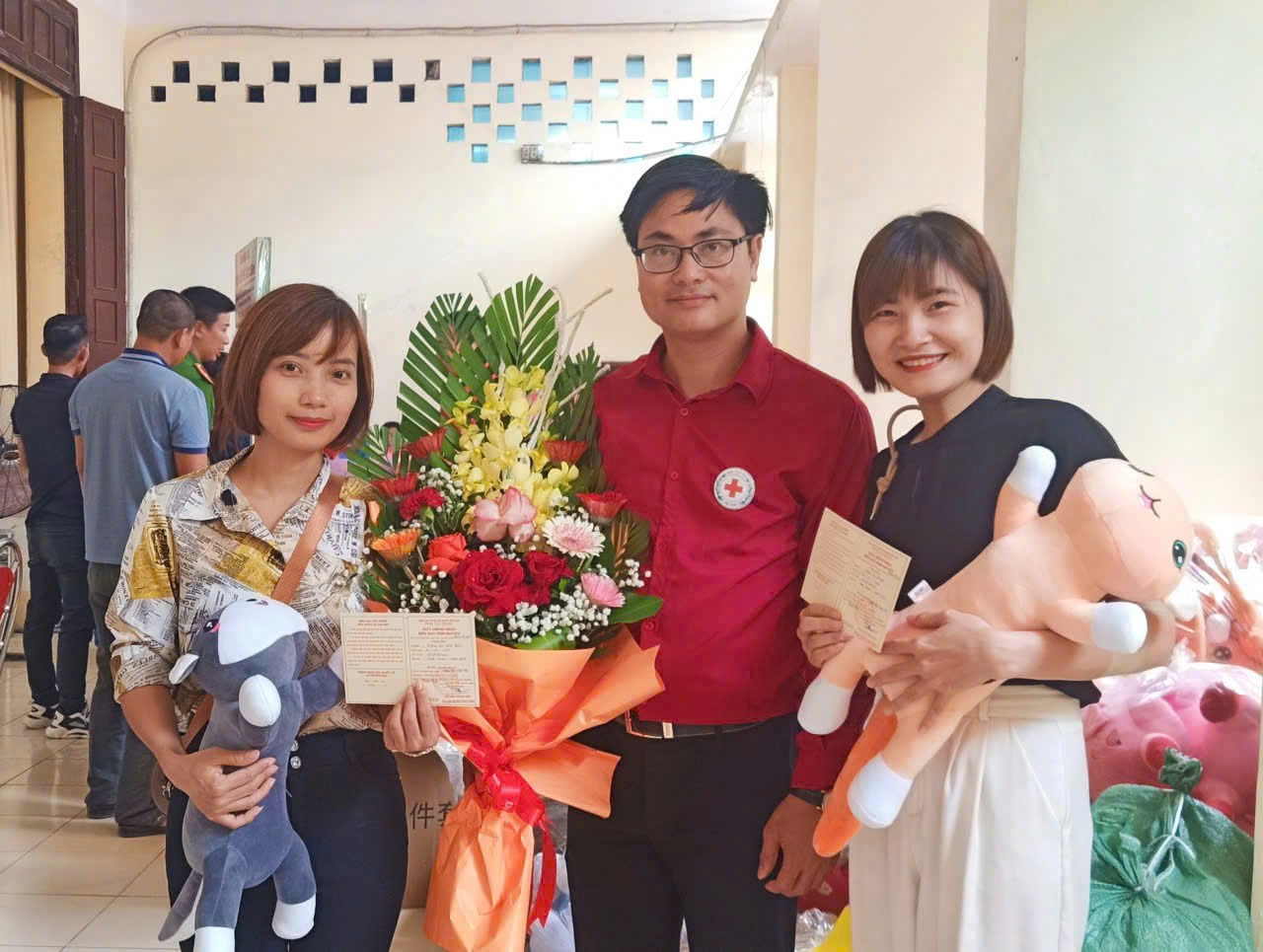 Lãnh đạo Hội Chữ thập đỏ tỉnh tặng hoa và trao giấy chứng nhận cho người dân phường Nam Định tham gia ngày hội hiến máu tình nguyện.