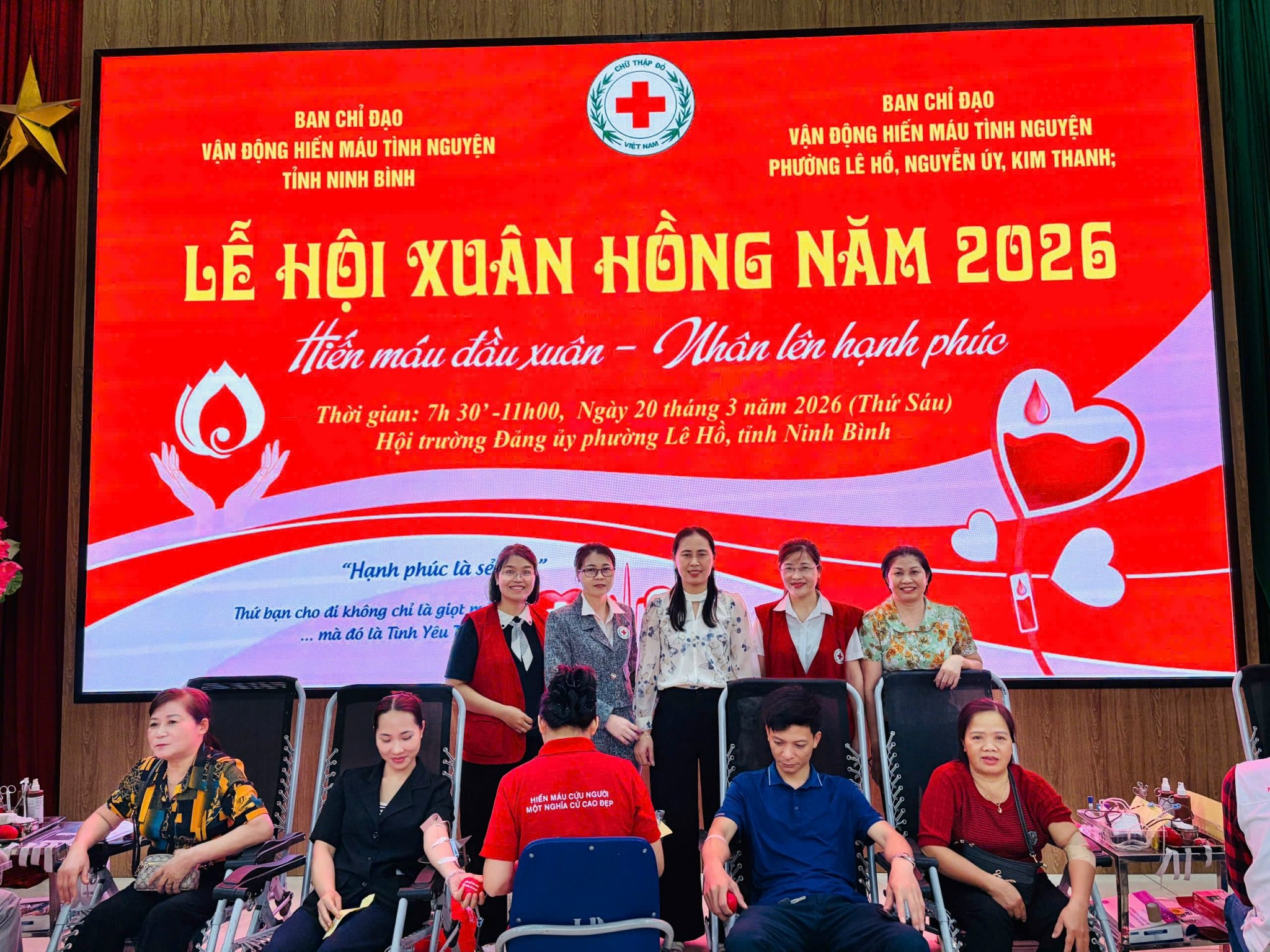 Sáng ngày 20/3/2026 chương trình hiến máu tình nguyện với chủ đề "Hiến máu đầu xuân - Nhân lên hạnh phúc" đã được tổ chức tại nhà Văn hóa Đảng ủy Phường Lê Hồ, tỉnh Ninh Bình, thu hút đông đảo cán bộ, công chức, viên chức, lực lượng vũ trang và nhân dân trên địa bàn tham gia. Chương trình do BCĐ Vận động HMTN tỉnh phối hợp với BCĐ vận động 3 phường Lê Hồ, Nguyễn Úy và Kim Thanh tổ chức.